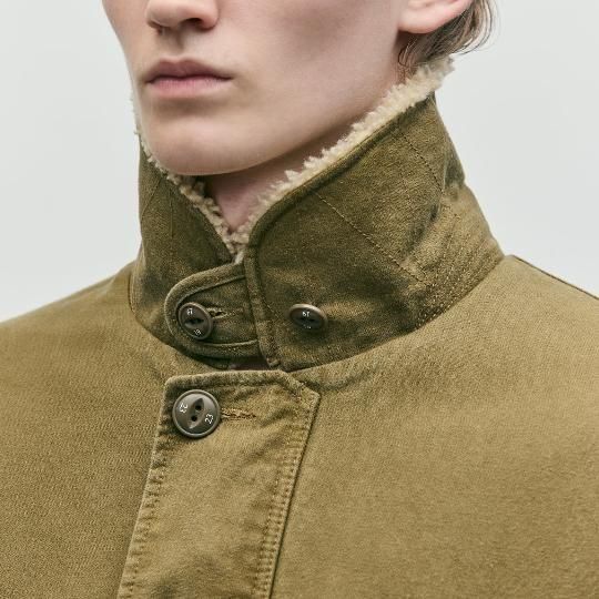 丈夫であり、程よい柔らかさのある素材。フロントはオリジナルボタン付きの前立てとファスナー留めを採用し、袖口はインナーリブ仕様。