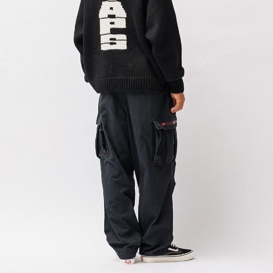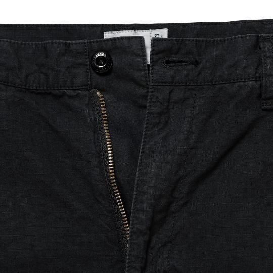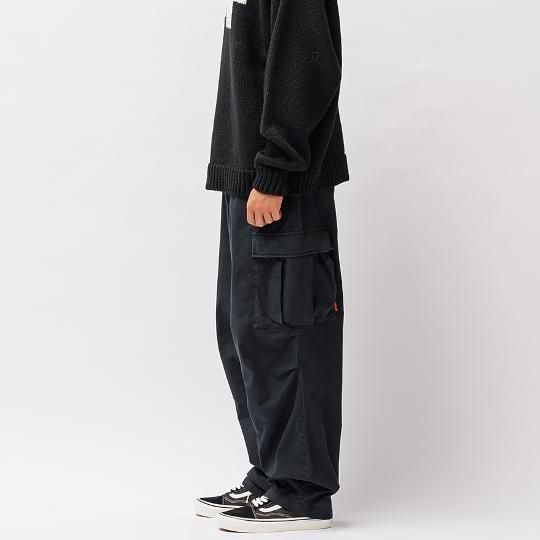 製品で硫化染めとバイオ加工を施した仕様。アコーディオン型のカーゴポケット右側に両端の斜線でサイズを表記するプリントネームを付属。