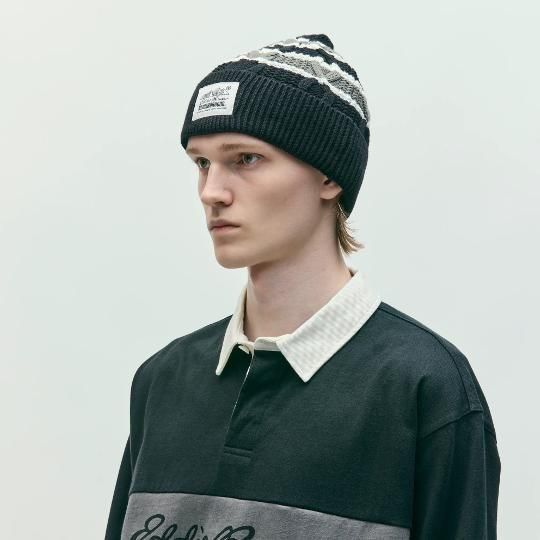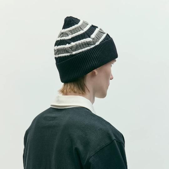 コットン糸で編み立てたボーダー柄のケーブルニットを使用したビーニー。